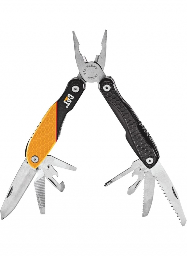 CAT 13 viename daugiafunkcis įrankis. Bendras ilgis: 16,2 cm Uždarytas Ilgis: 10,4 cm. Svoris: 280 g Nerūdijančio plieno įrankiai: ilgos nosies replės, replės, vielos pjaustytuvas, butelių atidarytuvas, tiesus atsuktuvas, vidutinis / mažas, dvigubas atsuktuvas, skardinė, Atidarytuvas.