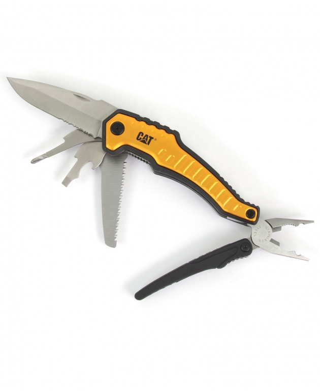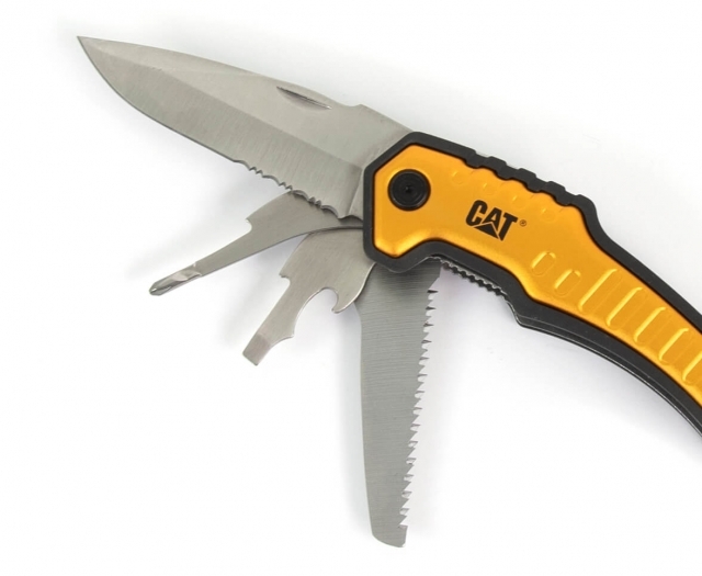 CAT XL Multi-Tool Bendras ilgis: 9 cm Uždaras: 16,2 cm. Komplekte yra maišelis, skirtas nešioti ant diržo. Nerūdijančio plieno įrankiai: peilis, pjūklas, viena dildė, Phillips atsuktuvas, tiesus atsuktuvas, butelių atidarytuvas, ilgos nosies replės, griebtuvas, vielos pjoviklis.